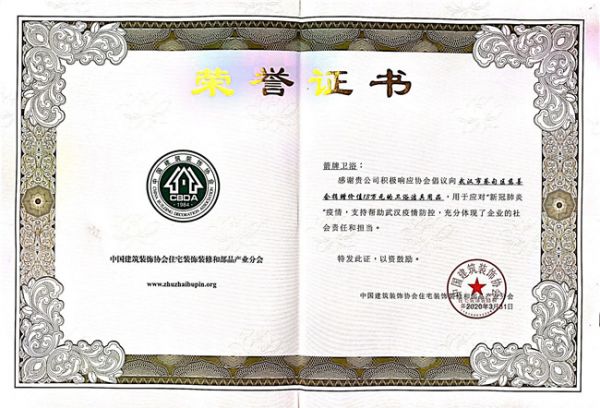 近日,箭牌卫浴也收到了来自中国建筑装饰协会的荣誉证书,以表彰箭牌卫浴积极响应政府号召,及时向武汉第十三医院援赠卫浴洁具物资,全力支援武汉疫情防控,充分体现了企业的社会责任与担当。