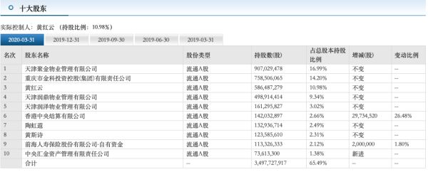 截至2019年年底,金科的十大流通股东中最大的是重庆亿万富豪黄红云及其一致行动人的持股比例为29.98%,「融创系」则持有29.35%的股份。其中,天津聚金的持股比例为16.99%。