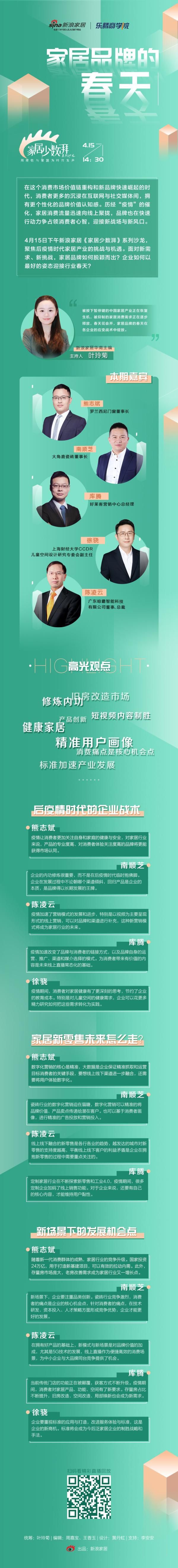 4月15日,新浪家居《家居少数湃》系列沙龙,聚焦后疫情时代家居产业的挑战与机遇。本期沙龙由新浪家居华南主编叶玲菊连线罗兰西尼门窗董事长熊志斌,大角鹿瓷砖董事长南顺芝,广东晾霸智能科技有限公司董事、总裁陈凌云,好莱客营销中心总经理库腾,上海财经大学CCDR儿童空间设计研究专委会副主任徐骁五位嘉宾,共探家居品牌应如何在后疫情时代脱颖而出,迎接行业春天。