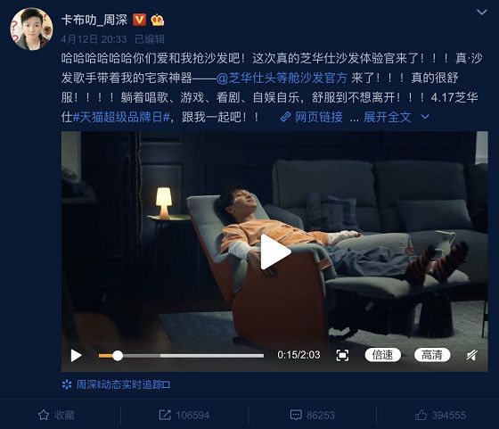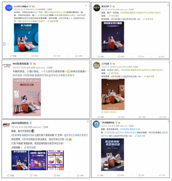 有产品品质做基础,更有真·沙发歌手周深担任首席体验官,使得一众粉丝狂欢。品牌曝光呈指数级增长,沙发歌手超神演绎宅家神器的视频播放量高达400w+,#宅家神器 躺赢夜半场##沙发歌手周深#的话题阅读量达到1.5亿+,互动量高达100万+;明星大咖齐发声,躺赢话题榜,当红歌手周深以及50余位微博b站抖音KOL联合发声,登顶b站热门榜,抖音和微博花絮以及鬼畜等自制视频播放2100W,+;更有网红在线battle,美妆、健身、游戏、煲剧、音乐五大领域头部主播在虎牙、一直播、淘宝多平台联动直播,超1600W+人次围观4.17芝华仕云发布会,引导成交284W,点燃#宅家神器,躺赢夜半场#。