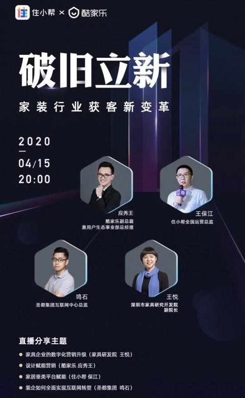 4月15日,双方趁热打铁,落地了一场主题名为“破旧立新,家装行业获客新变革深度解读”线上直播高峰论坛,深圳市家具研究开发院、圣都集团、住小帮以及酷家乐的高管负责人悉数出席,在线分享他们对线上获客的行业洞察和实战经验。