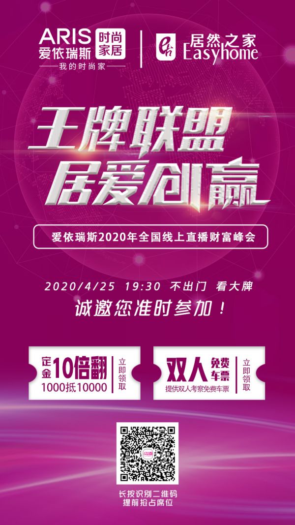 4月25日19:30,爱依瑞斯为满足全国新老客户及意向加盟朋友们足不出户看大牌的需求,以“王牌联盟,居爱创赢”为名,爱依瑞斯携手居然之家开启2020年全国线上直播财富峰会,此次直播招商会是两大王牌企业的再次通力合作,携手创赢,打造一场家居行业线上直播招商的盛宴。