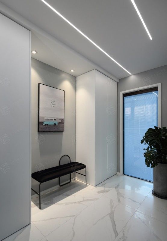 入户门厅简约大气,黑色金属材质的换鞋凳造型简洁,纤细的凳腿线条流畅。两侧的白色鞋柜与吊顶齐高,与玄关的色彩搭配和谐。墙上一幅简单的装饰画瞬间让小小的玄关空间生动起来。