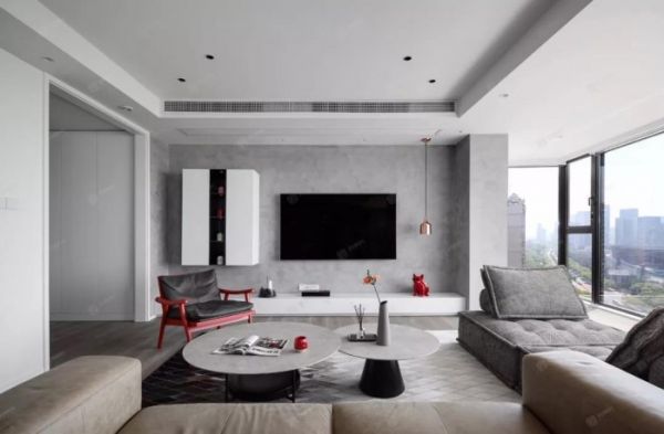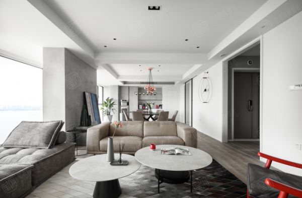 客厅空间整体简约明快,以浅白、高级灰、质感黑、几何形等构成现代都市质感风。在黑白灰的主色调中,红色的沙发和狗狗摆件展示了主人对生活的热情,在循规蹈矩中寻找思维的跳脱,空间宁静舒适却又不失活力。整面的落地窗保证了光线及视野,也满足了日常生活自然舒适的要求。