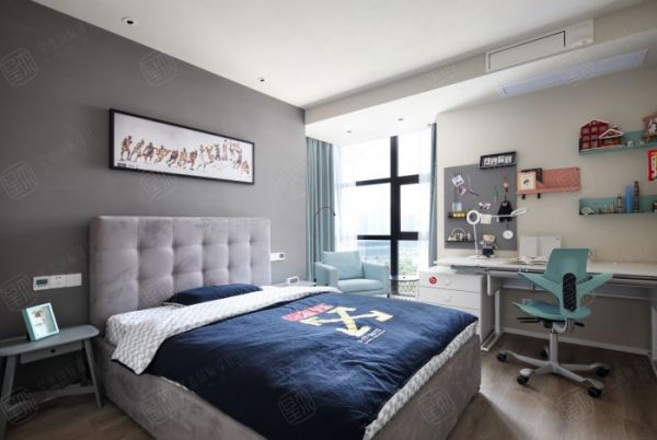 跳跃的色彩搭配是儿童房最大的特点,大胆独到的用色手法,色彩深沉而图案明亮的被子,以及床头那幅篮球群星照完美展现了孩子身上天马行空的想象力和对生活的美好向往。