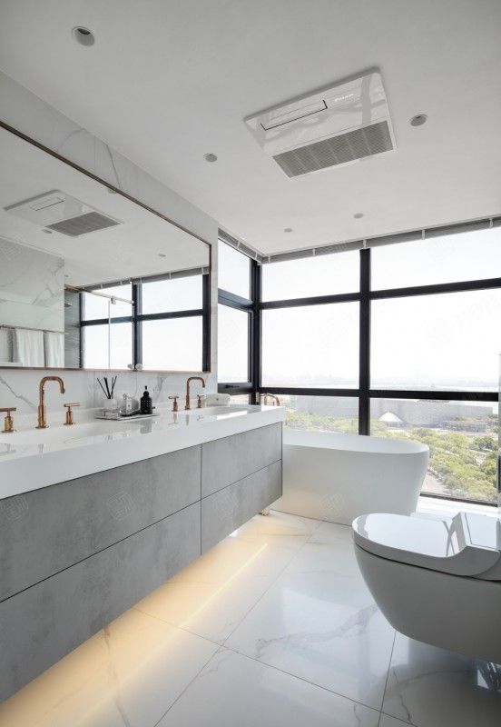 浴室临窗而设,美不堪言的湖景为沐浴增添了一份情趣。线条柔和的卫浴中和了棱角分明的台盆柜体,恰当的绿植装饰让浴室告别单调沉闷,为空间增添一抹生机。