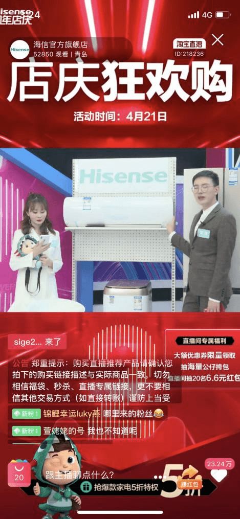本次活动以海信天猫官方旗舰店为主阵地,以店铺直播为主要形式,辅以微淘、微博、微信公众号等站内外渠道推广相配合,形成完备的传播闭环,直接拉动千万粉丝参与。仅4.21当日1小时的时间里,海信天猫官方旗舰店就有超过5万的新增粉。