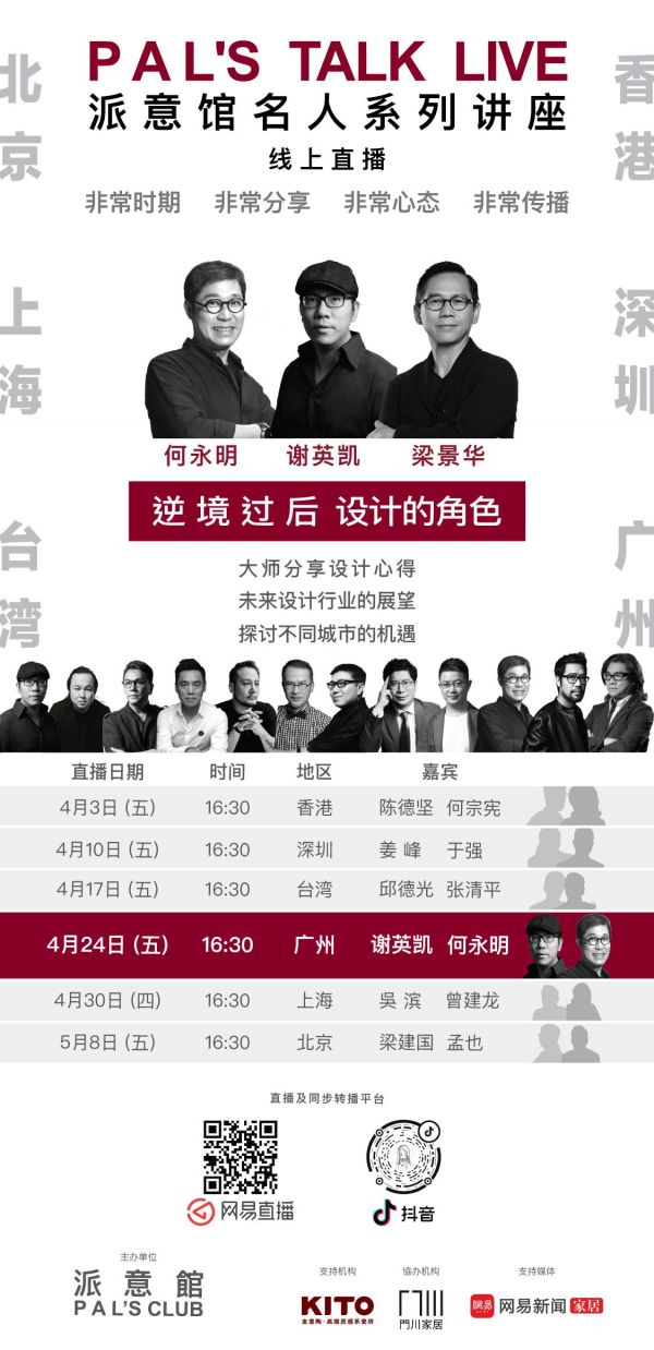 4月24日(周五)16:30,2020年派意馆名人系列讲座第四期(广州站),梁景华先生将携手谢英凯先生、何永明先生带来一场专业设计分享会,共同影响更多渴望交流的设计师、更多热爱生活的人。