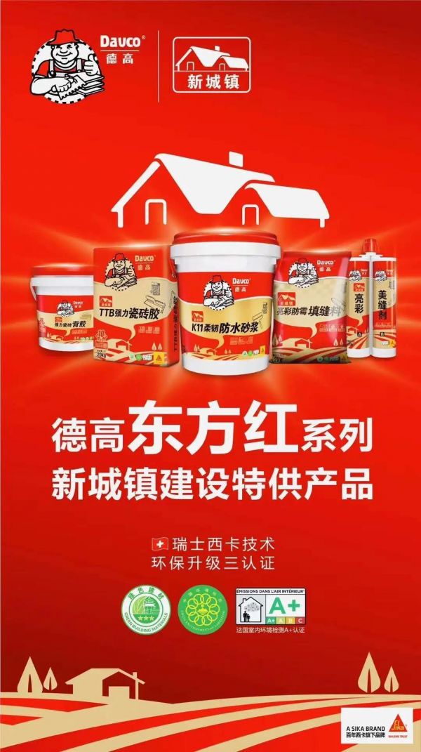 德高东方红系列,专为县镇居民打造,涵盖防水、贴砖、填缝美缝的绿色装修产品,融汇瑞士西卡高端技术,环保升级,实力硬核,使用安全更健康!