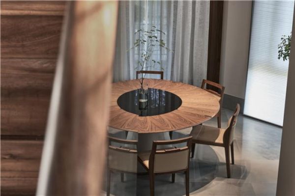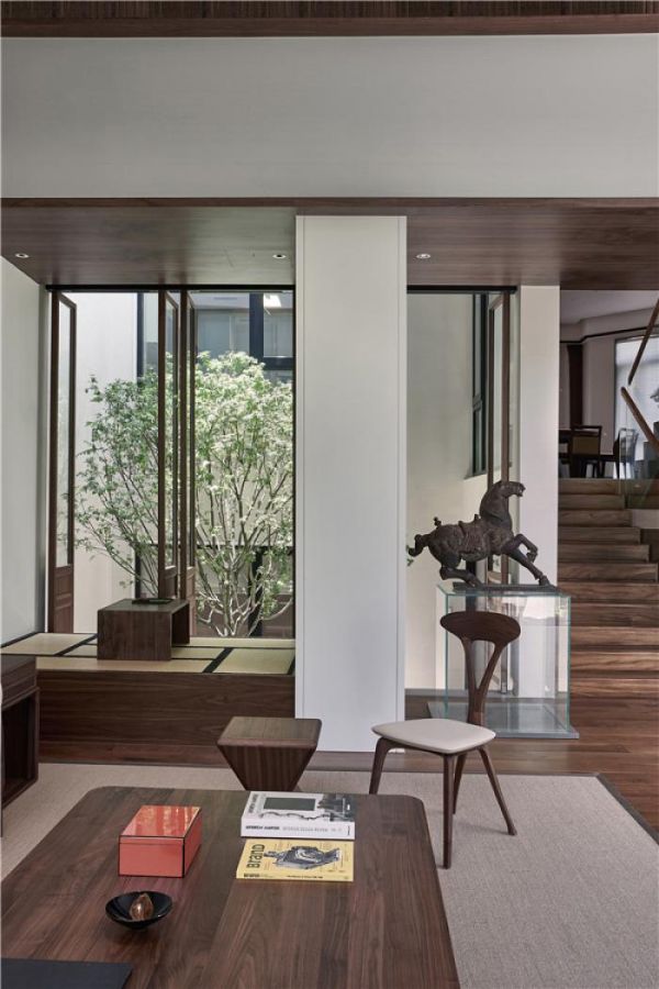 一楼整个客厅保留原有墙体结构,用白色拉丝艺术漆作为主基调,通过正面落地玻璃,让花园园林景观作为客厅主背景,充分尊重自然的力量,让空间与室外达到自然和谐共生,让每一位在里面的人,心可以打开,与自然对话。客厅利用原有的结构柱子设计成开放式的和室品茶区,品茶区与天井之间加了活动胡桃木屏风,让此区域在一开一合之间与绿植、阳光、空气发生关系。