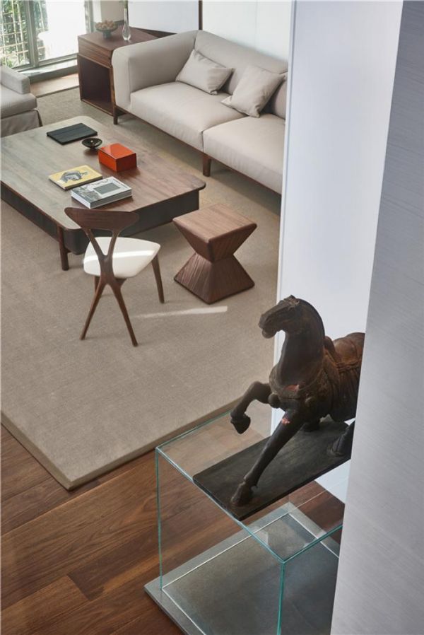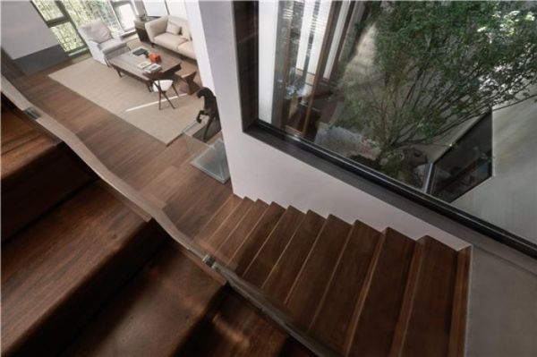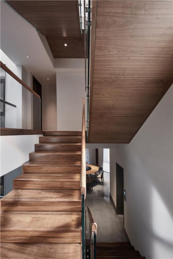 整条楼梯以北美胡桃木拼接,让原本多层的楼梯分隔开左右两边的空间,少了几分硬度,多了几分温度,边界模糊化,让整个上下楼层有了情感的链接。