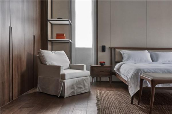 三楼部分,整层为主人区域,楼梯上端开了一个天井窗,让充足的阳光可以洒下来,主卧区域通过设计成几扇屏风式开门,让打开的时候与开放书房区域可以共通,业主喜欢阅读,有大量书籍收藏,整个设计成阵列式的藏书方式。书房分为阅读区与和室区域,让人在其中可以选择不同的场景方式,阅读、品茶与休息。这不乏是一种舒适的生活方式。