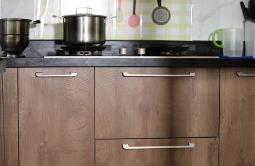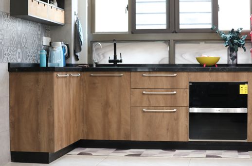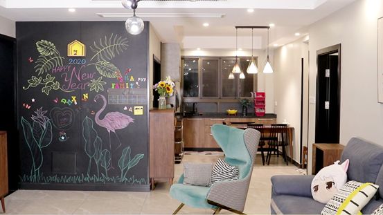 而且李女士家中的西厨是完全开放式的。因此,厨房的风格非常影响整体公共空间的视觉美感,时光印橡完美融合了其现代北欧的装修风格,搭配客厅和餐厅的黑胡桃木家具也丝毫不维和,又非常的方便打理,既有满分的颜值又非常实用。此外,考虑到家里有两个孩子,设计师推荐了F4星的柜体,和这款圆润的拉手,环保的同时也避免了孩子磕碰的风险,温暖而贴心。
