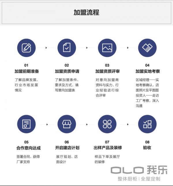 而我乐橱柜具体的加盟流程可分为8步:前期准备—加盟资质申请—加盟资质评审—加盟实地考察—合作意向达成—开启建店计划—出样产品及装修—验收。流程非常清晰,8步就可以拥有自己的我乐橱柜加盟店。