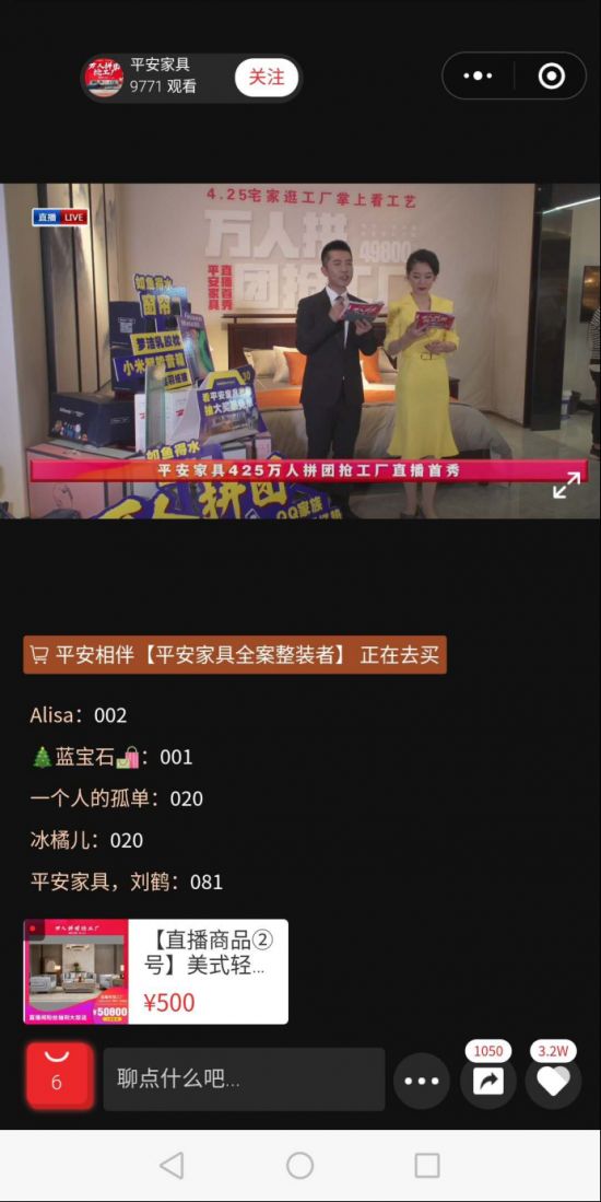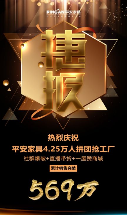 2020年4月25日晚19:30分,平安家具《4.25万人拼团抢工厂》活动正式开播,在整个家居市场“遇冷”的特殊时期,平安家具依靠“社群+直播+云店”的线上营销新模式,用一场3小时的直播活动,斩获569万销售额!