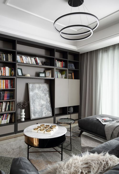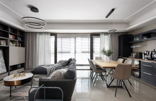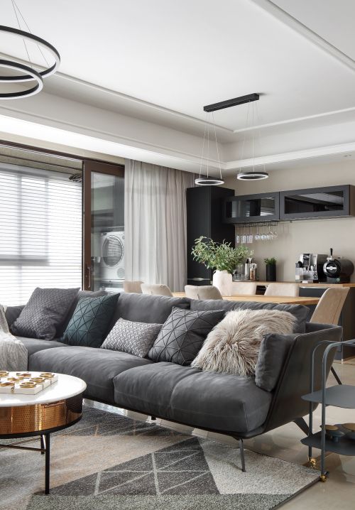 开敞式的客餐厅,冷暖相融,客厅像一个深沉的男士在自己的精神世界里漫游,灰色与黑色的融合静谧而高雅,地毯与布艺沙发的柔软很好地中和了冰冷的气息,圆几的金属色点缀其间,增加了空间的一丝奢华气息。