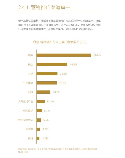 线上营销一直是家居软装行业的短板所在,从《2018中国墙纸墙布行业白皮书》关于营销的调查报告中可以明确看到这一点,包括在做2019年行业白皮书的调查过程中,也还是存在同样的问题。行业是传统制造业,销售来源于传统线下渠道,营销方式多为传统的代言、户外广告等等,总给人以“传统”的印象。行业属性固然如此,线下渠道也必不可少,但总还是需要有更多“新兴”的东西来为企业、为行业实现创新。58同城发布的第一季度家居市场报告中也指出,线上化程度已经成为了家居企业实力的硬指标。