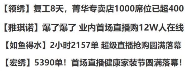 2020年,墙纸墙布甚至整个软装行业的“动作”都很不一样,纷纷赶上了“直播”的潮流。从二月至今,已经听到了许多堪称“火爆”的好消息:领绣二月复工仅8天,借线上直播等方式菁华的招商数便高达400家,同阶段的线上“开年钜惠”活动也在短时内破了千单;雅琪诺首推「不看展会看工厂」的工厂实况直播,反响热烈,举办的首场直播购观看人数高达12万,达成3148单;如鱼得水3月招商大捷,此外,举办的超级直播抢购会也在2小时内完成2157单的好成绩;近期宏绣举办的直播健康家装节也吸引了超过16万的观众,订单成交量高达5390单……光看这些数字,就能感受到直播营销带来的显著效果。