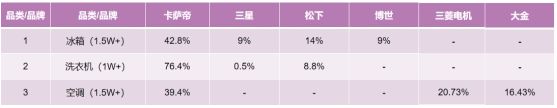 冰洗空市场中高端主力品牌基本不变,其中卡萨帝销量又是第一。1.5W+冰箱市场,卡萨帝份额为42.8%,松下为14%,三星和博世均为9%;1W+洗衣机市场卡萨帝份额76.4%,松下8.8%,三星0.5%;1.5W+空调市场卡萨帝份额39.4%,三菱电机为20.73%,大金为16.43%,格力跌出前三。