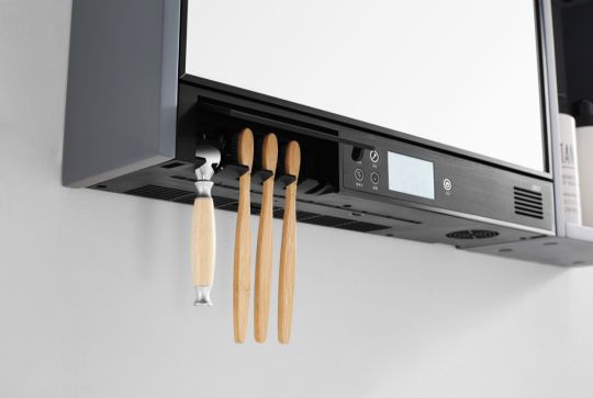 针对这个生活场景,金柏丽雅多功能智能浴室柜牙刷烘干消毒器,利用均匀热气快速加热牙刷,使牙刷中的水分迅速烘干,同时开启紫外线杀菌模式,做到烘干与杀菌二合一,确保牙刷干净卫生,让每次使用牙刷都跟新的一样。