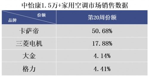 据 中怡康发布的 第 20 周数据显示, 在 1.5 万 + 家用 空调市场,卡萨帝份额为 50.68 %,三菱电机为 17.88 %,大金为 4.14 %。