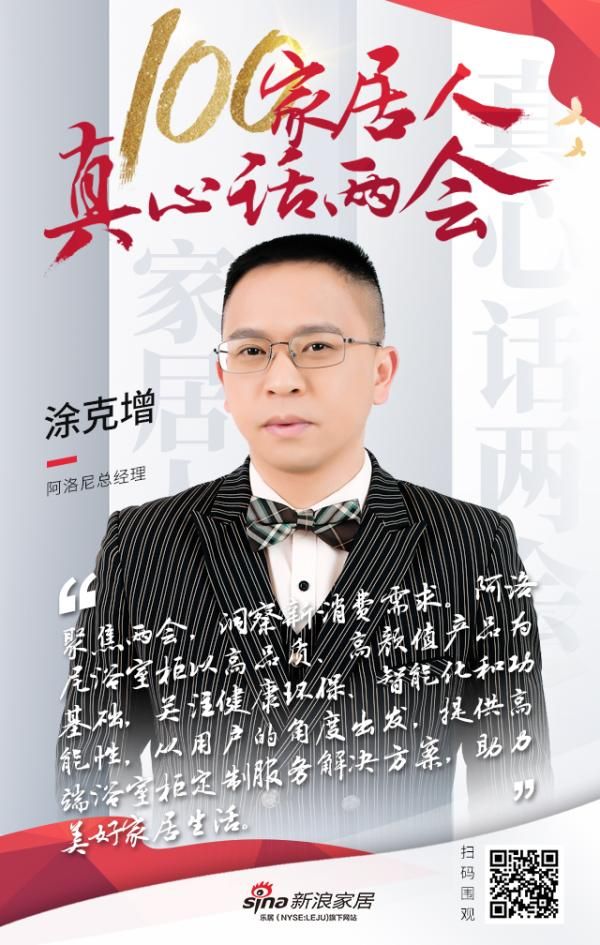 阿洛尼总经理 涂克增:“聚焦两会,洞察新消费需求。阿洛尼浴室柜以高品质、高颜值产品为基础,关注健康环保、智能化和功能性,从用户的角度出发,提供高端浴室柜定制服务解决方案,助力美好家居生活。”