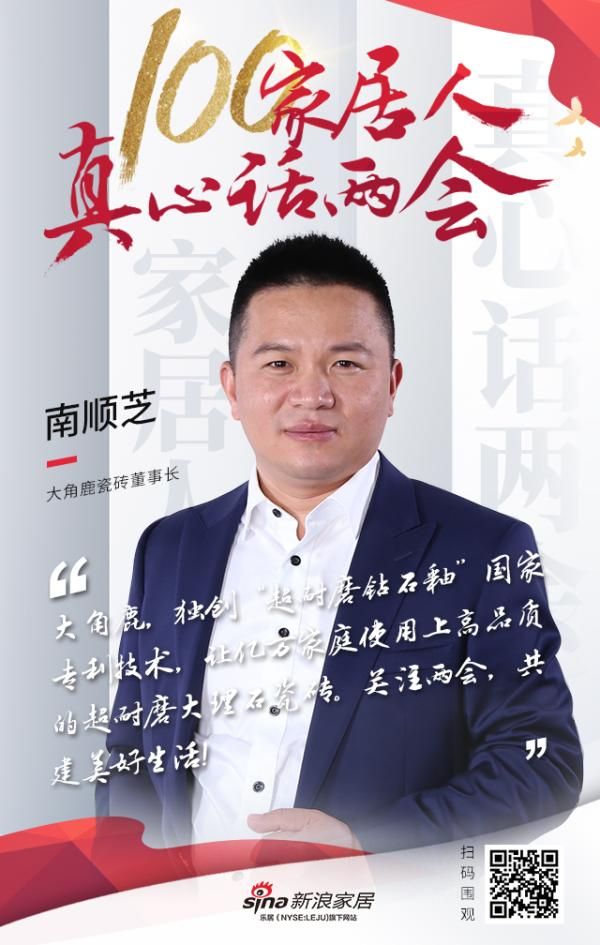 大角鹿瓷砖董事长南顺芝:“大角鹿,独创“超耐磨钻石釉”国家专利技术,让亿万家庭使用上高品质的超耐磨大理石瓷砖。关注两会,共建美好生活!”