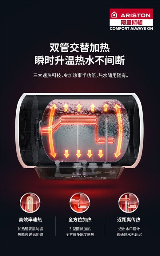 而针对电热水器加热速率慢这一产品使用的短板,阿里斯顿CLEAN LINE电热水器采用了双管交替加热技术,以此达到瞬时升温热水,热水不间断的使用效果;采用的Z型面状加热,相较传统的电热水器而言,其受热面和加热均衡度都有大幅提升;近出水口排布,更进一步实现热水使用时的直通无延迟。三大速热科技强强联手,从此加热效果事半功倍,再配合其自身3000W半胆速热功能的加持,不仅热得快,而且更能用得省,安享健康、纯净的洗浴时刻,无需为电费使用所忧心。
