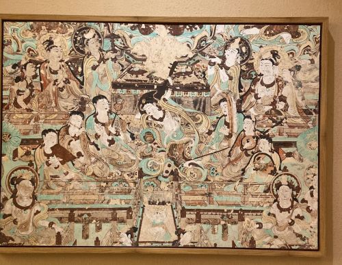 此次大盛敦煌展,也展出了很多飞天及乐舞壁画。如释迦说法图之双飞天,四身飞天在庄严华丽的宝盖上方互相追赶,前后顾盼,扬手散花嬉戏;画面中流云飞动,花雨纷落,充满生气和欢乐的情趣。飞天姿态柔美、飞动感强,充满了欢乐、自由、吉祥的气氛。又如观无量寿经变舞乐图,舞者容貌姣好妩媚,左手高举琵琶反背身后,右手转向背后弹拨,上身前倾右屈,右腿高提,左腿独立,伴随着快节奏的旋律边弹边舞,形成著名的“反弹琵琶”动作。“反弹琵琶”是琵琶演奏中的一个高难度动作,在实际演奏中,只是一瞬间的效果。壁画作者极其准确地抓住了这一独特优美的造型,以高超精湛的技艺描绘出了这一精彩的舞姿,就像抢拍下了一幅精美绝伦的特写。