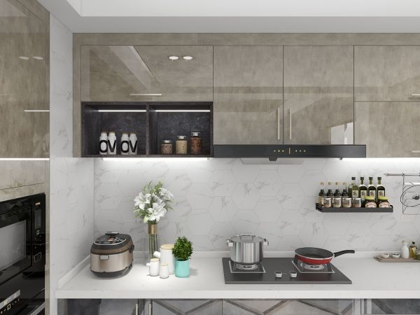 半开放吊柜的精妙设计,开放柜收纳常用小物,随拿随放,省去开柜麻烦,封闭式柜体则可将物品隐藏于无形,保持整洁美观。同时,内置嵌入式电器收纳,隐藏电器,减少多余占地空间,避免大型厨房电器堆放台面而造成厨房视觉上较为拥挤,留出更多空间,尽情安排。