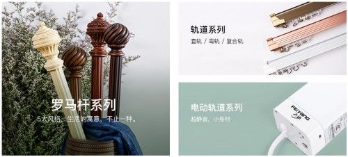 飞扬静音纳米轨道——拉合不可思议,顺滑随心所欲;飞扬艺术罗马杆—— 时尚多款百搭,服务中国家庭;飞扬专利窗帘盒——独家专利、即装即用、轻奢环保。