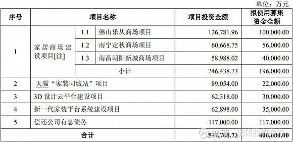 红星美凯龙计划19.60亿元投入至家居商场建设项目,包括佛山乐从商场项目10亿元、南宁定秋商场项目5.60亿元和南昌朝阳商城商场项目4亿元。居然之家则拟募集资金19亿元用于门店装修改造项目。