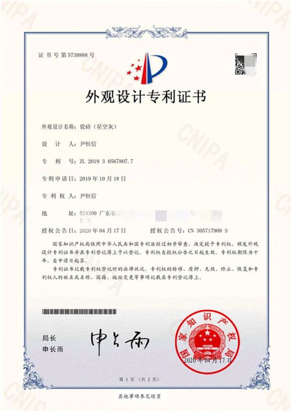 柔金能量瓷砖(星空灰) 专利号:ZL201930567807.7