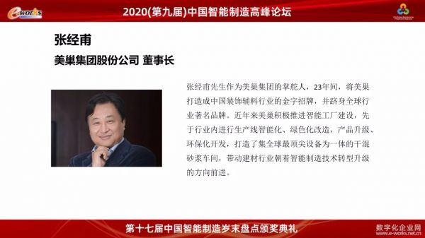 美巢集团在此次中国智能制造高峰论坛上,凭借“无人值守采购收货管理系统赋能美巢集团智能供应链建设”荣膺“中国智能供应链杰出应用奖”,美巢集团董事长张经甫获“2019年度中国推进智能制造杰出CEO”称号。