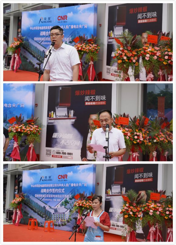 6月9日,中山市荣星电器燃具有限公司与中央人民广播电台央广网战略合作签约仪式暨顺德新城区荣星厨电体验店开张仪式、“荣星品牌年、中国万里行”中国家电发源地顺德新城区荣星电器全国巡游首发仪式隆重召开。荣星公司总经理林伟汉、中央人民广播电台央广网崔代宾先生、荣星公司领导、经销商代表、媒体代表共同出席了此次庆典活动。可谓三喜临门,喜气洋洋!