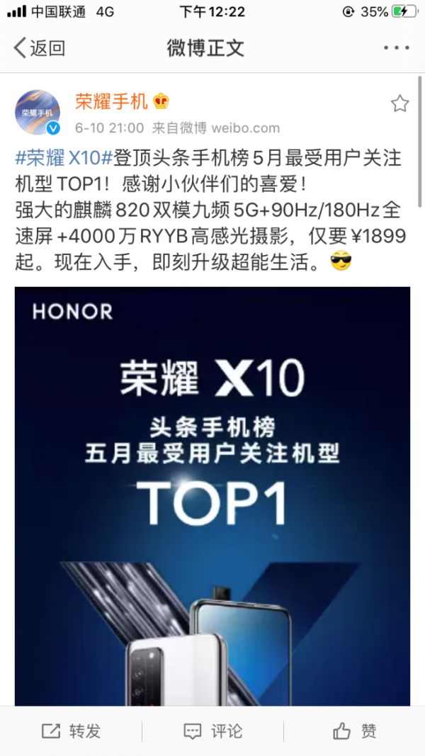 荣耀X10荣获五月最受欢迎手机 1899元高性价比 性能爆发!