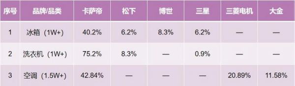 高端品牌中,冰箱市场卡萨帝、博世、松下上涨,三星下滑;洗衣机卡萨帝、博世上涨,松下、三星下滑;空调卡萨帝上涨,三菱电机和大金下滑。看得出来,高端品牌大多在稳定增长,其中卡萨帝尤为明显,那么在这波增长中,谁又是卡萨帝最大的对手?