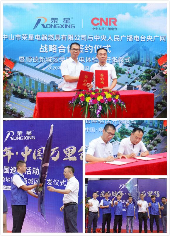 6月9日,中山市荣星电器燃具有限公司与中央人民广播电台央广网战略合作签约仪式暨顺德新城区荣星厨电体验店开张仪式、“荣星品牌年、中国万里行”中国家电发源地顺德新城区荣星电器全国巡游首发仪式隆重召开。荣星公司总经理林伟汉、中央人民广播电台央广网崔代宾先生、荣星公司领导、经销商代表、媒体代表共同出席了此次庆典活动。可谓三喜临门,喜气洋洋!