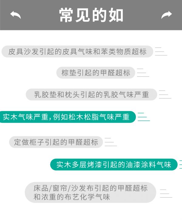 常见的如:皮具沙发引起的皮具气味和苯类物质超标,棕垫引起的甲醛超标,乳胶垫和枕头引起的乳胶气味严重,实木气味严重,例如松木松脂气味严重,定做柜子引起的甲醛超标,实木多层烤漆引起的油漆涂料气味,床品、窗帘、沙发布引起的甲醛超标和浓重的布艺化学气味……