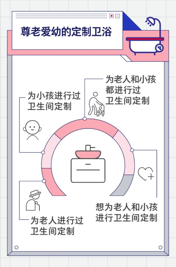 人性化代表着个体需求的认知与尊重。调查显示,有超过66%的家庭为家中的老人或小孩对卫生间进行了定制化的调整,或者正在进行这方面的考虑和筹备。