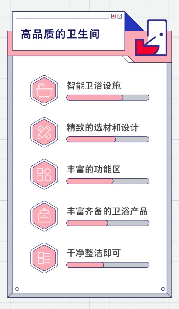 个性化的背后是用户对美与实用性的追求。在调研中,随手可放书或手机的置物架、别致艺术的瓷砖风格、强⼤的收纳空间、喜欢的香氛香味、贴心的小夜灯成为最受欢迎的五类个性化设计。