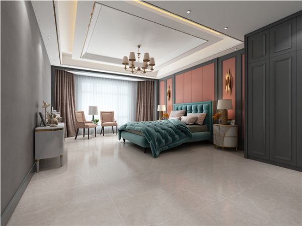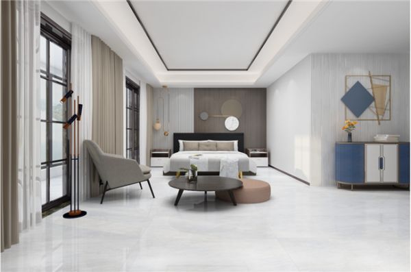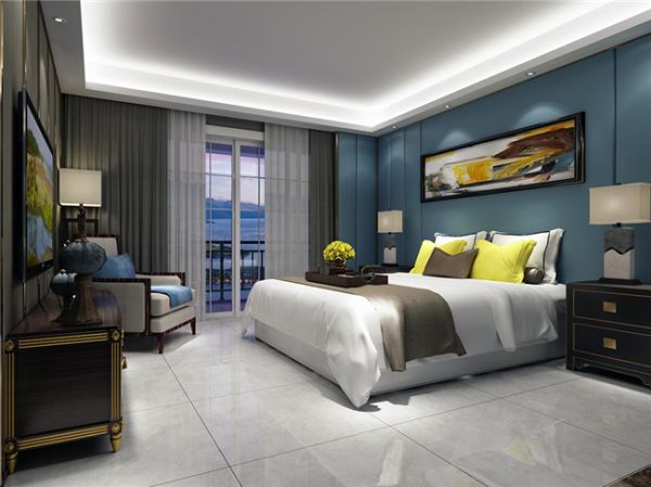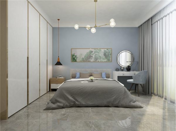 现代简约:卧室整体以白色为主,加以少点的蓝色、灰色做点缀。地面瓷砖以灰白交错的纹理色泽,远远看去如同高耸入云的山峰,让房间更加简约大方,空间通透而不失细节,张弛有度。