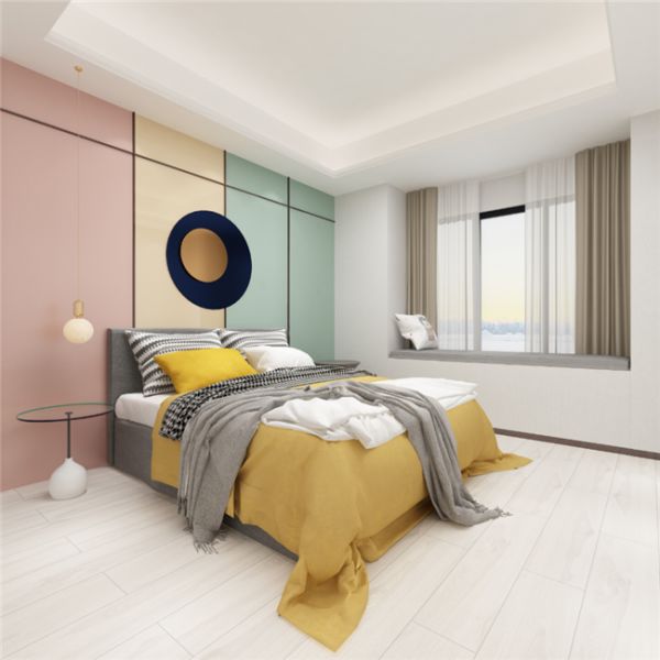 现代简约:卧室整体感觉色调素雅温馨,是比较清新的现代简约风。背墙板由不同的靓丽颜色拼接并列,氤氲出柔情与细腻,在日光的晕染下宛如梦幻之境。原木色系的木地板,隔板对称的方格铺贴,让空间显得更大。