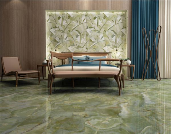 中式设计:卧室以清新绿色与自然木色搭配,舒爽悦目,没有繁杂的装饰,让空间看上去更整洁。中间绿色背墙板的部分和地砖颜色风格协调一致,打造更好的视觉美感。