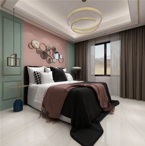 欧式设计:卧室整体偏暖色调,粉橙背墙板+墨绿色大床,糅合了可爱粉的床上用品做点缀,恰到好处地避免空间的乏味与沉闷。此外搭配干净利落的铺贴砖线条,棱角分明的几何图形,整个卧室空间优雅而具有艺术性。