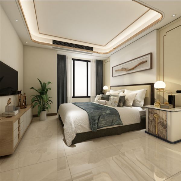 中式设计:该卧室颜色偏沉稳,床头横幅淡雅壁画增加典雅气息。地砖是萃取西班牙稀缺普佩斯大理石名石之精华,细腻温和的色调,具有独特的魅力,白色纹理粗细有致散落其中,静中带动,自由、悠然,耐人寻味。