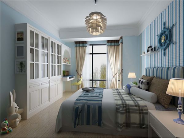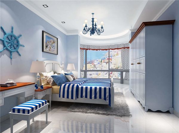 地中海设计:蓝与白相结合,浪漫而又唯美,线条是构造地中海风格形态的基础,纯美的色彩是它的主体,独特的装饰深受人们的喜爱。光洁靓丽的大理石地面,与地中海的各种元素碰撞,让卧室充满舒适、惬意。