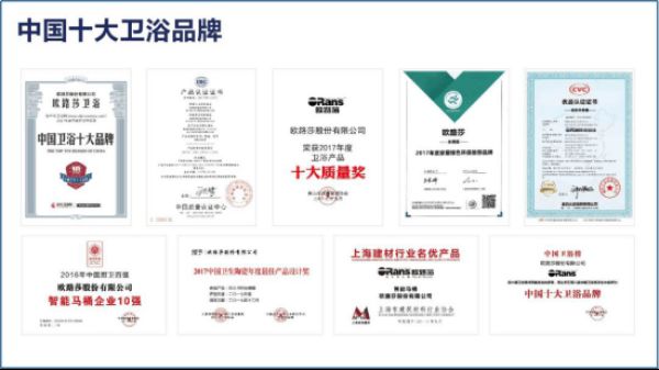 欧路莎卫浴,连续12年荣获中国卫浴十大品牌称号,2015年,欧路莎与意大利著名设计师Nilo Gioacchini签约合作,全面开启欧路莎卫浴国际化设计之路;2016年,“意大利米兰品牌创新奖”、“红点国际设计大奖”;2017年,“中国家居产业卫浴领军品牌”、“沸腾杯质量金奖”、“中国卫生陶瓷年度最佳产品设计奖”;2018年,“居然之家战略合作品牌”、“中国卫浴品质创新奖”;2019年,获得“消费者放心品牌”、“家居绿色环保推荐品牌”、“卫浴产品十大质量奖”,2020年斩获“十大智能马桶品牌”称誉等。