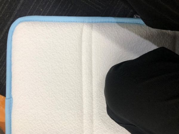 床垫中间有一层白色围边,是网格面料材质,这个面料很舒服,摸起来很柔软感觉挺透气。整张床垫的高度有22厘米左右,满满的扎实感。
