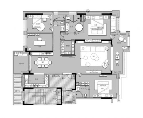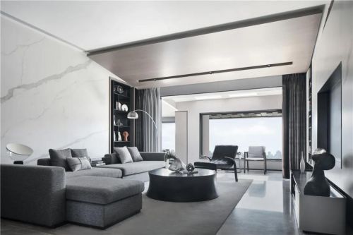 循着季节能发现存在于大自然的美,而循着空间也同样能创造不同的设计视角。空间位于建筑的顶层,屋顶结构不规则,这给设计之初带来了许多约束。 太谷形上从整体性去规划空间,原天花结构被重新规整后,大胆呈现块面穿插,立面辅以氤氲雅致的白底石纹岩板,焕活空间韵律。一体化的设计,整个居室自然流动,如诗如画。